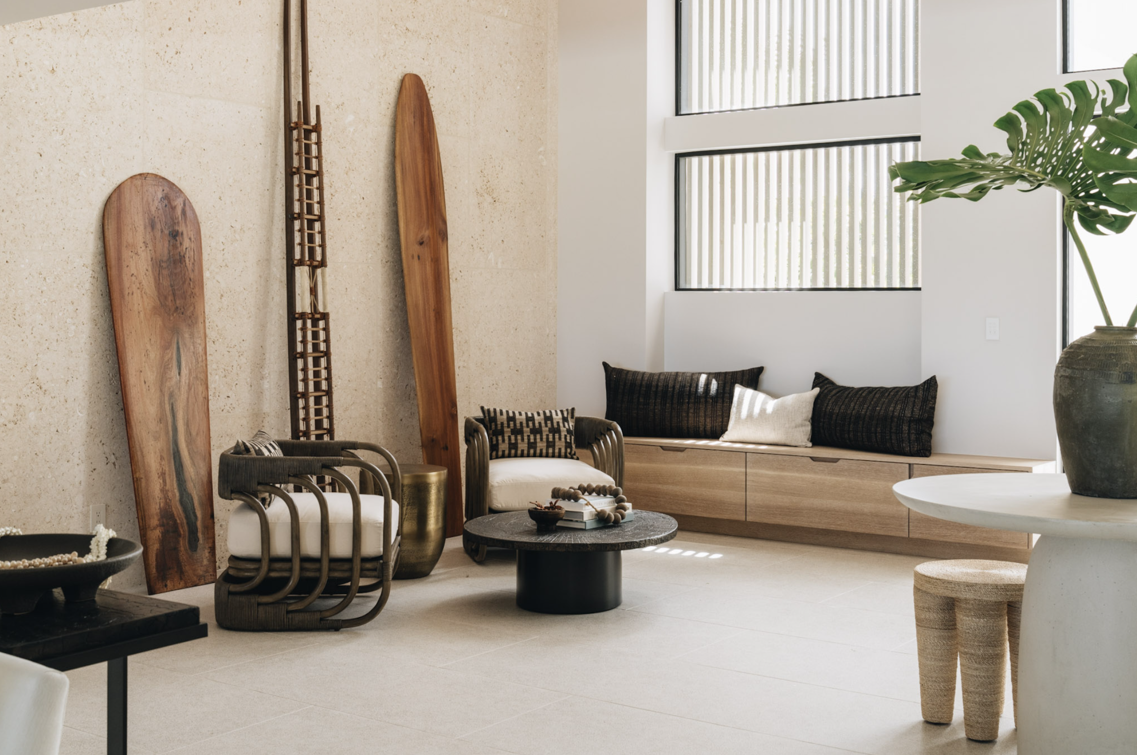 This waterfront residence underwent a complete renovation and transformation, reimagined to embrace light, airiness, and a sense of well-being. Designed with a spa-like, wellness-focused approach, the interiors feature coral stone walls that add rich texture, paired with custom fluted cabinetry and natural grasscloth wall coverings for warmth and dimension. Expansive windows draw in ocean breezes and natural light, while thoughtful materiality throughout creates an atmosphere of calm and effortless luxury. The result is a home that feels both restorative and deeply connected to its coastal setting.